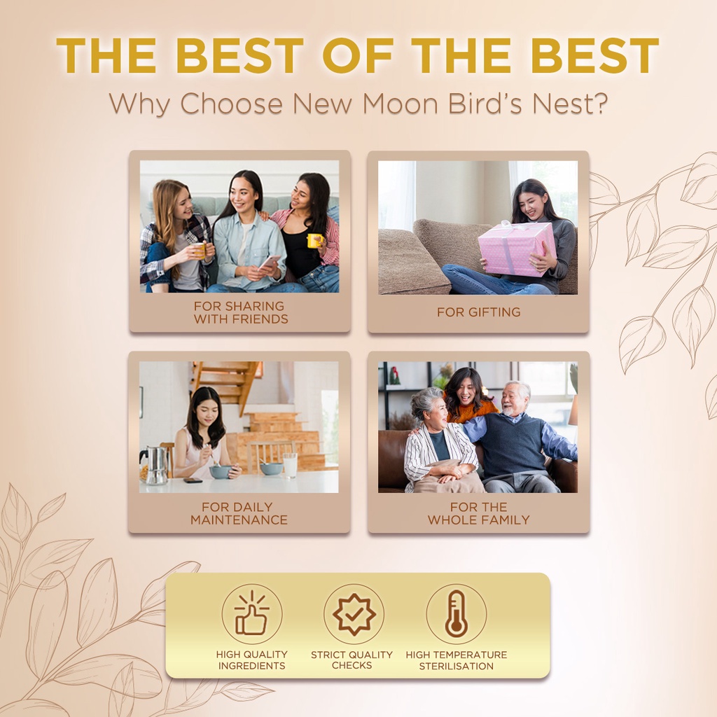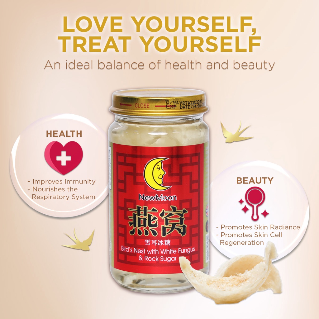 Carefully selected 100% genuine bird’s nest is balanced by the lush flavor of the finest white fungus and a hint of pure rock sugar. With a perfectly harmonious blend of premium ingredients, the result is a beloved staple in every pampering ritual. NEW MOON BIRD’S NEST WITH WHITE FUNGUS & ROCK SUGAR is made from superior grade bird’s nest. white fungus and rock sugar. It is an ideal food supplement for all ages. It is prepared according to traditional simmering process under modern and strictly controlled methods. It can be consumed directly from the bottle, chilled or warmed, according to individual preference.