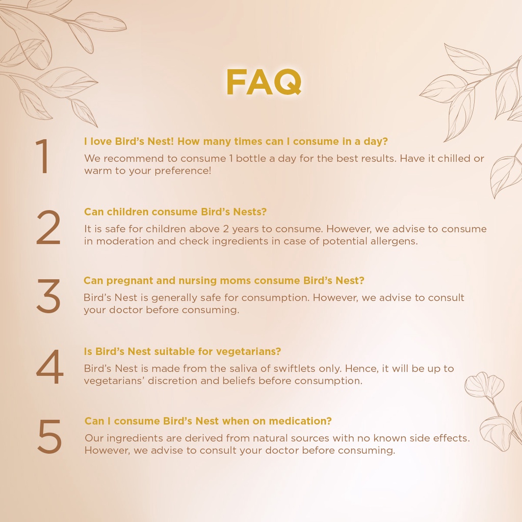 Water, Sugar, White Fungus, Collagen Peptide (Fish), Bird’s Nest, Permitted Stabilisers (INS 401, INS 415, INS 418), Permitted Acid Regulator (INS 500(ii)) & Permitted Colouring (INS 150a) as food conditioners
